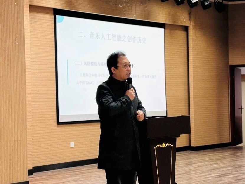 李鹏云教授以专业系统的讲解,从历史发展的角度系统梳理了音乐人工智能演进的三个阶段:第一阶段专家系统算法作曲时代,通过将作曲手法、和声学等专业技术转化为数学规则,实现基础的音乐创作,但受限于规则刚性;第二阶段风格模仿时代,借助机器学习技术,通过分析作曲家作品特征实现不同风格音乐的生成,突破了统计规律学习的瓶颈;第三阶段深度学习时代,以生成式人工智能为代表,利用大规模数据集训练实现具有艺术水准的音乐自主创作。在应用展示环节,李鹏云通过丰富的音频案例,现场演示了AIGC、Suno Studio等工具在旋律生成、和声编排等场景的实践运用,展现了生成式AI在作曲、编曲、音乐制作等领域的创新应用,并特别强调提示词在AI音乐创作中的关键作用。同时,李鹏云从课程建设、教学改革、创作实践等方面介绍了国内外院校在音乐人工智能教育中的探索经验,为我院相关专业建设提供了重要参考。最后,他就"AI会否取代音乐创作者"“面对AI作为学生或教师应具备怎样的能力”"如何评估AI音乐作品的艺术价值"等问题与我院师生展开深入交流,提出了专业性的见解。王建成副院长在总结中指出,当前音乐教育创新的重点在于师生如何把握人工智能发展机遇,优化教学、科研与创新模式。他强调,"人工智能+音乐"课程建设是未来专业发展的重要方向,全体教师应主动探索AI技术与音乐课程的融合路径,推动人才培养模式的转型升级。