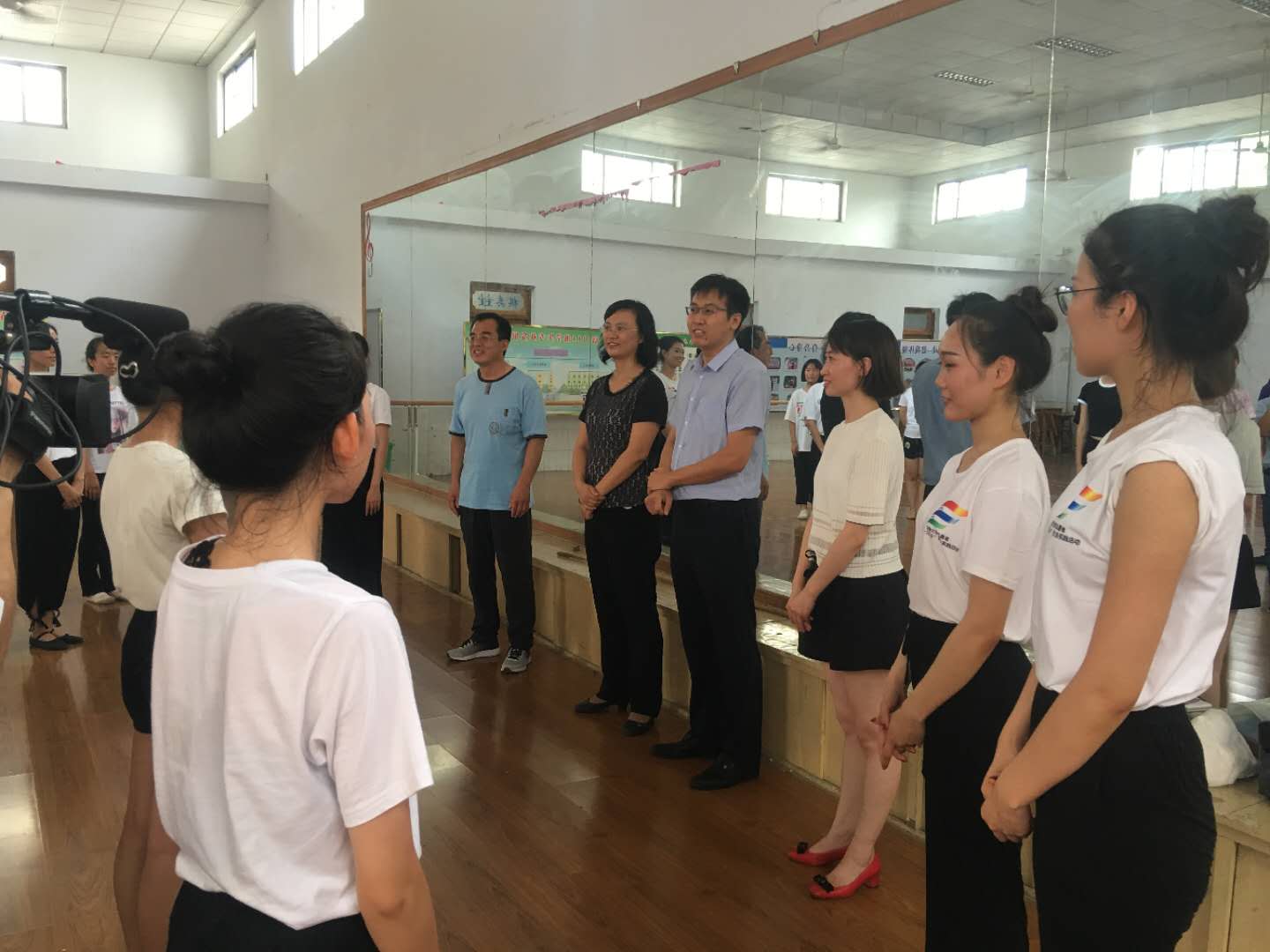 今天下午四点,周村区副区长李寅萍、副区长马谦到校慰问我院的参加社会实践的老师同学。区领导和校方领导一起观看了已排练成型的合唱和舞蹈节目,区里领导对我们的老师同学的辛苦付出表示感谢,对短短两天时间就能呈现出如此水准的节目大加赞赏,希望通过此次实践活动,能有更多的优秀学生进入永利304官网唯一学习。当区领导看到舞蹈排练的场所条件艰苦时,当即表示马上改善教学条件,这使参加实践的师生备受鼓舞。