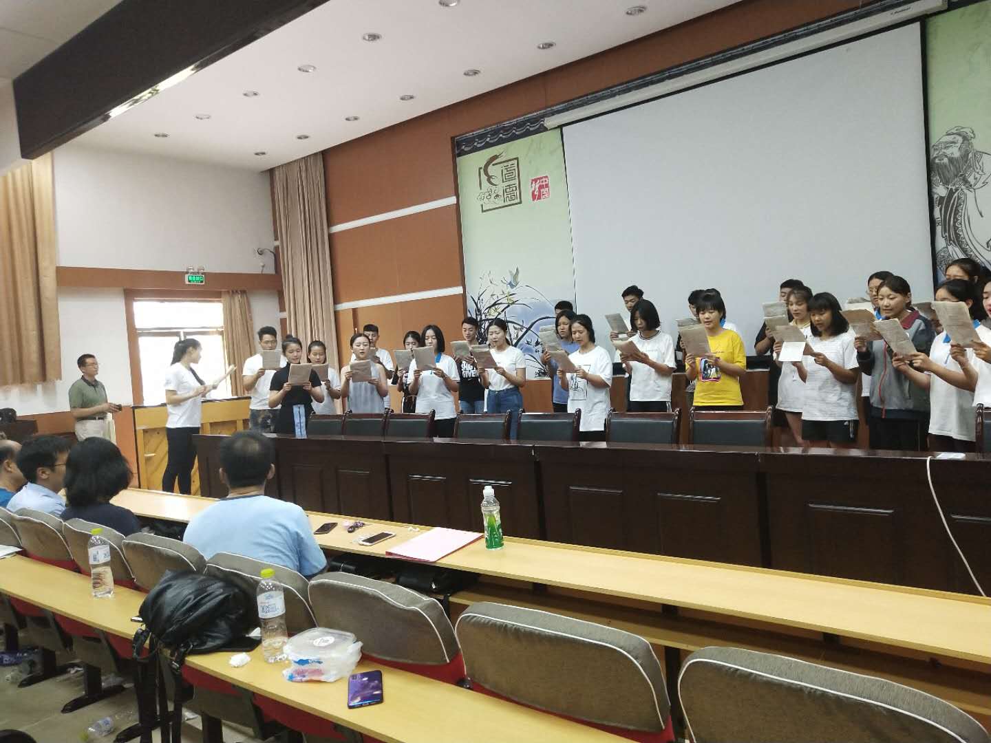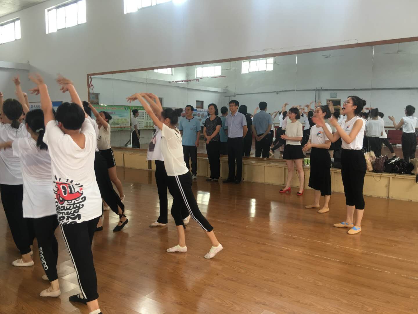 今天是活动开展的第三天,相较前两天,师生关系相处日益融洽,学生表现的出来的状态也越来越好,课堂教学效果显著,上课也从容了许多。声乐组里,老师们先是带领大家一起进行开声练习,然后对二声部合唱《天耀中华》进行带歌词的演唱,并对他们的附点节奏有一定的训练,课间休息时,同学们都争先恐后地表现自己,展示自己的才艺,最后又对《我们的新时代》进行分声部训练,大家都能够与老师积极互动;舞蹈组里,杨阿红老师带领着4名舞蹈老师已经把《 我们的新时代 》完整地排练了下来。实验中学的学生们通过这三天的培训,从他们身上已经能明显地看出了舞蹈学生的最基本的体态和身姿。