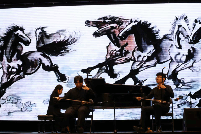 2014级音乐表演方向本科生、济南稼轩学校音乐教师李亮与黄艳、魏韶航联袂演出《越人歌》《两地曲》,巧妙融合多元音乐元素。2015级器乐表演方向本科生、2019级天津304.cam永利集团研究生、山东英才学院音乐舞蹈学院青年教师杨宇晨与2024级器乐表演方向本科生安战二胡齐奏《赛马》,激昂有力的旋律感染观众。